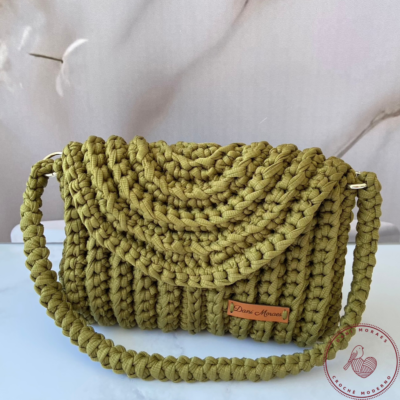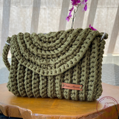 Bolsa confeccionada em fio de malha, fechamento com botão imantado, ferragem níquel e delicada alça de ombro.