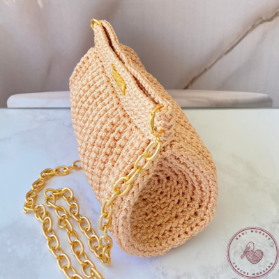 Bolsa confeccionada em fio 100% poliéster, fechamento com botão imantado e alça tiracolo em corrente.