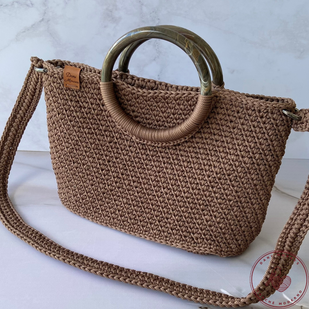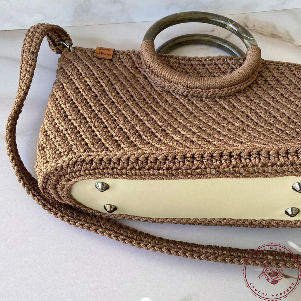 Bolsa confeccionada em fio 100% poliéster, fechamento com 2 botões imantados, ferragem ônix, material sintético bege, alça de mão redonda em resina e alça tiracolo com 105cm.